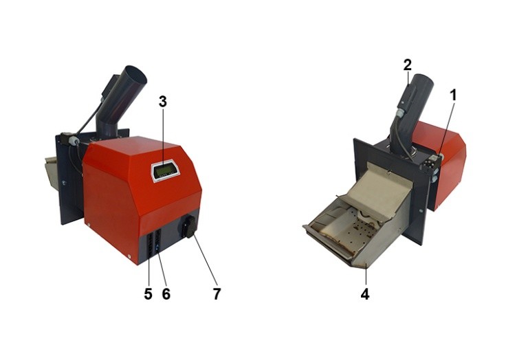 | 3. | wyświetlacz jednostki elektronicznej palnika | 7. | wtyk przewodu łączącego palnik z kotłem (zasilanie) |